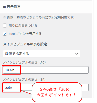 100vh」に設定 - 「メインビジュアルの高さ(SP)」を「