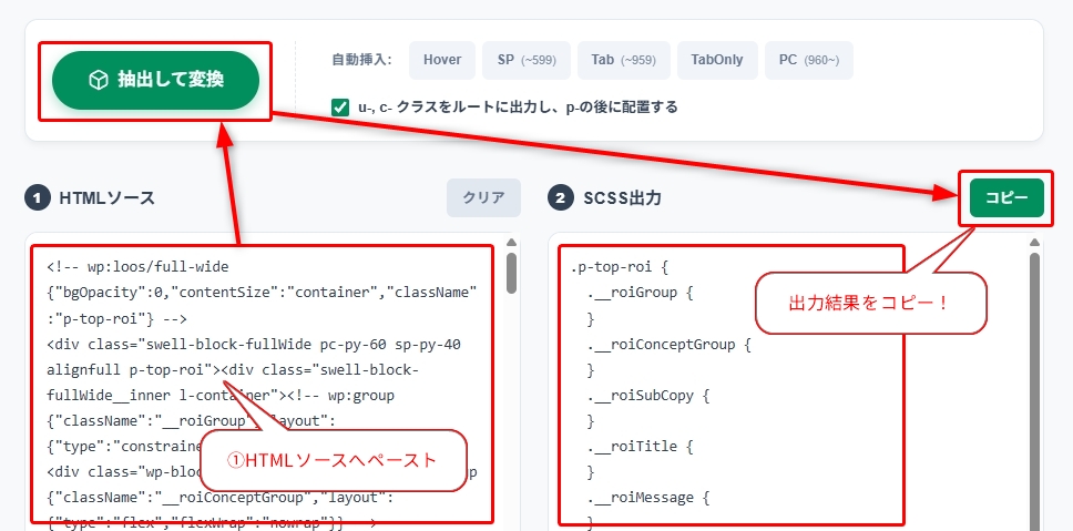 このツールを使えば、HTMLを貼り付けるだけで、不要なクラスを自動で捨て去り、必要なクラスだけを綺麗なSCSSのネスト構造にして出力します。